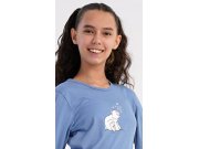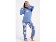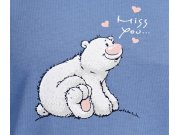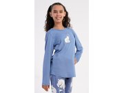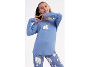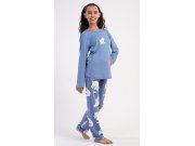 Dječja pamučna duga pidžama Medo i pingvin. Ženska pidžama sastoji se od majice s dugim rukavima i dugih hlača. Majica s okruglim izrezom ukrašena je slikom polarnog medvjeda. Ovaj motiv se ponavlja i na hlačama, koje u struku imaju gumu i vezicu za stezanje, nemaju džepove. Korišteni pamučni materijal je mekan i ugodan na dodir.