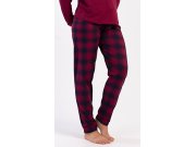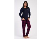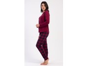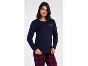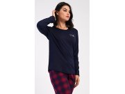 Ženska pamučna duga pidžama Emma. Ženska pidžama sastoji se od majice s dugim rukavima i dugih hlača. Jednobojnu majicu s okruglim izrezom krasi mali natpis na prsima. Karirane hlače imaju u struku gumu i vezicu za stezanje, nemaju džepove. Korišteni pamučni materijal je mekan i ugodan na dodir.