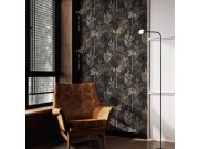 Flis tapeta s vinilnom površinom, crna štuk podloga, motivi livadskih trava i listova u nijansama smeđe, sive i metalik zlatno-smeđe.