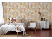 Flis tapeta s vinilnom površinom, smeđe-narančasta podloga, motivi cvijeća i listova, zlatni detalji, fina tekstura.