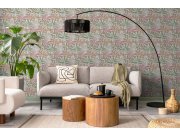 Flis tapeta s vinilnom površinom, zelena podloga, stilizirani cvjetovi u nijansama sive, bijele, sivo-plave, smeđe i ružičaste, fina tekstura.