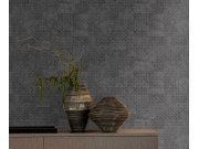 Luksuzna flis tapeta s vinilnom površinom, geometrijski uzorak u stilu Art deco, nijanse polusjajne sivo-crne / antracit boje, sjenčanje stvara prostorni efekt.