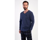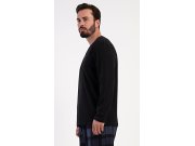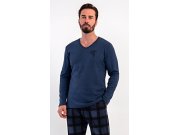 Muška duga pamučna pidžama Erik. Muška pidžama sastoji se od majice s dugim rukavima i dugih hlača. Majicu s okruglim izrezom krasi mala slika na prsima. Karirane hlače imaju u struku gumu, vezicu za stezanje i praktične džepove. Korišteni materijal INTERLOK sa 100% udjelom pamuka je podatna i ugodna na dodir.