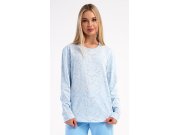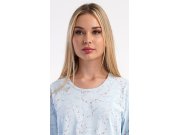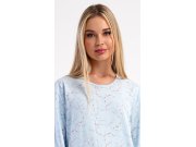 Ženska pamučna duga pidžama Lauren. Ženska pidžama sastoji se od majice s dugim rukavima i dugih hlača. Majicu s okruglim izrezom krase sitni cvjetovi. Jednobojne hlače imaju u struku gumu i vezicu za stezanje, nemaju džepove. Korišteni pamučni materijal je podatak i ugodan na dodir.