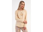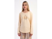 Ženska pamučna duga pidžama Monika. Ženska pidžama sastoji se od majice s dugim rukavima i dugih hlača. Majica s okruglim izrezom ukrašena je na prsima slikom plišanih medvjedića. Ovaj motiv se ponavlja i na hlačama, koje u struku imaju gumu i vezicu za stezanje, nemaju džepove. Korišteni pamučni materijal je podatak i ugodan na dodir.