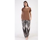 Ženska pidžama s kratkim rukavima Julie. Ženska pidžama se sastoji od majice s kratkim rukavima i dugih hlača. Majica je jednobojna, bez tiska, ima okrugli izrez. Hlače s otisnutim geometrijskim uzorkom imaju u struku gumu i vezicu za stezanje, nemaju džepove. Korišteni viskozni materijal je podatak i ugodan na dodir.