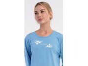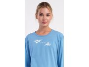 Ženska pamučna duga pidžama Natural life. Ženska pidžama sastoji se od majice s dugim rukavima i dugih hlača. Jednobojna majica ukrašena je slikom cvjetova i grančica. Ovaj motiv se ponavlja i na hlačama, koje u struku imaju gumu i vezicu za stezanje, nemaju džepove. Korišteni pamučni materijal je mekan i ugodan na dodir.