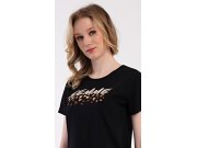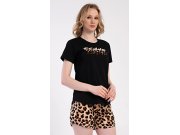 Ženska pamučna pidžama kratke hlače Femme. Ženska pidžama sastoji se od majice kratkih rukava i kratkih hlača. Jednobojnu majicu ukrašuje natpis FEMME i leopard uzorak. Ovaj motiv ponavlja se i na kratkim hlačama koje u struku imaju gumicu i vezicu za zatezanje, bez džepova. Korišteni pamučni materijal je ugodan i mekan na dodir.