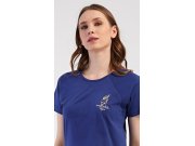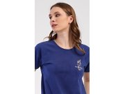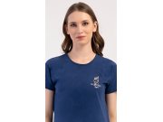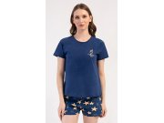 Ženska pamučna pidžama kratke hlače Zvijezde. Ženska pidžama sastoji se od majice kratkih rukava i hlača na kratke. Jednobojnu majicu ukrašava slika školjke. Hlače s printom morskih zvjezdica imaju gumicu u struku, bez džepova. Korišteni pamučni materijal je ugodan i mekan na dodir.