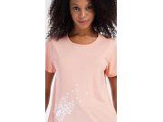 Ženska pamučna pidžama kratkih hlačica Mače. Ženska pidžama sastoji se od majice kratkih rukava i hlačica. Jednobojnu majicu ukrašava slika mačeta i raznuhana maslačak. Motiv mačeta ponavlja se i na hlačicama koje u struku imaju gumicu i vezicu za zatezanje, bez džepova. Korišteni pamučni materijal ugodan je i mekan na dodir.