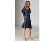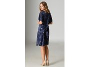 Ženska satenska spavaćica kratkih rukava Mjesec i zvijezde. Spavaćica ugodne duljine do koljena ima čipku na ramenima i remen za zatezanje. Tamnoplava tkanina košulje otisnuta je sitnim zvjezdicama. Korišteni satenski materijal ugodan je i mekan na dodir.