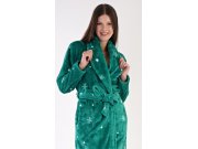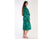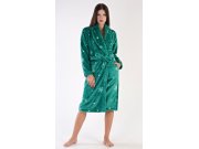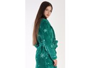 Ženski soft ogrtač dugi s ovratnikom u obliku šala Vločky. Ženski dugi ogrtač s ovratnikom u obliku šala, remenom za zatezanje i džepovima prikladan je nakon kupanja kao i za opuštanje kod kuće na kauču. Ogrtač je otisnut pahuljama u kombinaciji tamnije zelene i bijele. Korišteni soft materijal je nježan, paperjast i podatljiv na dodir.